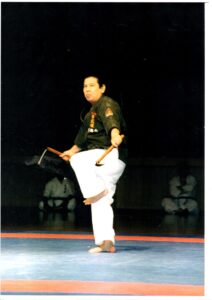 始めにノブさんがトゥンファー、次にシゲさんが棒、そして私がサイを演舞した。僕らは舞台の広さを意識しながら前後左右への移動の歩幅を注意深く確認して演武した。そして古武道の演武の最後に極めの気合を「キェーイ」と腹の底から発して演武を終了。一礼して元の控えに何事もなかったように戻った。