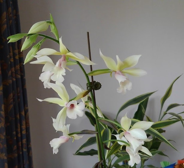 オリジナル交配品種が咲きました。3度目の開花です。Den.tosaense x Den.anosmumです。残念ながら期待したDen.anosmumの香りは全く遺伝していません。tosaenseよりも花径は大きくなっています。