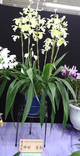 第44回「全沖縄らん展示会」が2022年4月7日~10まで浦添市のメイクマン本店にて開催された。参加者47名出品数300鉢で過去10年で最多の参加者、出品数でした。私はPhaius系のラン類8点を出品しました。その中のGastrophius Pololei Sunsetが最高賞の蘭大賞を受賞しました。この大会は沖縄県内の蘭愛好家の最大の展示会です。これまで奨励賞、銅賞が最上位でしたがやっと頂点に立つことが出来ました。とても嬉しいことですが、本種の最大能力を引き出したわけでは無く、未だ力量不足を感じています。